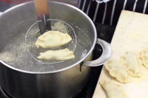 تحتاج إلى طهيها لمدة 3-5 دقائق ، حتى يتم ذلك سوف يطفو على السطح إلى الأعلى. بعد ذلك ، يوصى بقلى الزلابية في مقلاة ، ثم يتحول العجين مقرمش. عندما تخدم من فوق ضعي شريحة من الزبدة.