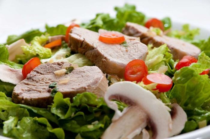 سلطة لذيذة مطبوخة مع لحم خنزير مقلي ومسلوق الفطر ، حل كبير لتناول العشاء في المنزل. حاول أن تفعل مثل هذه السلطة لتشعر الثنائي العطاء من اللحوم و الفطر.