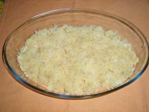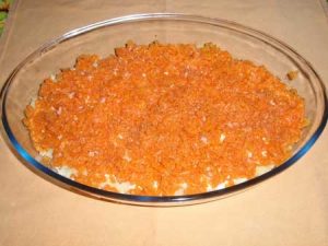 - ضعي الجزر المبشور على تفاحة مع البطاطا. الفلفل و الشحوم مع القشدة الحامضة.