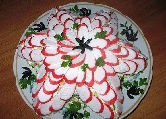 اصنع سلطة كلاسيكية بعصي السلطعون في المنزل ، لكن جعله في التصميم الأصلي. هذا الطبق لديه أكثر من ذلك نسيج خفيف وذوق دقيق.