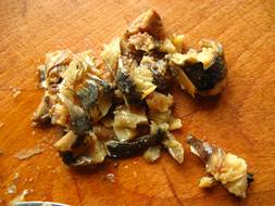 Sprats مقطعة إلى عدة أجزاء ، وإزالة ذيول.