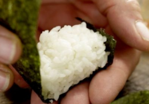 - لفة الكرة من الأرز والضغط عليه بلطف في المنتصف. يختتم حول قطاع نوري والغراء حواف نوري.
