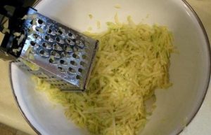- غسل الكوسة ، قشر ، صر. إلى الملح. ضعي على غربال لتكدس العصير. انتصر.