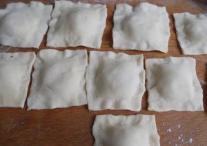 - طرح طبقتين رقيقتين من العجين. طبقة واحدة لتشويه البيضة. انتشار ملء الكرات على ذلك مع ملعقة صغيرة. غطاء الطبقة الثانية من العجين. اضغط على العجين بين الحشوة. ختم الرافيولي.