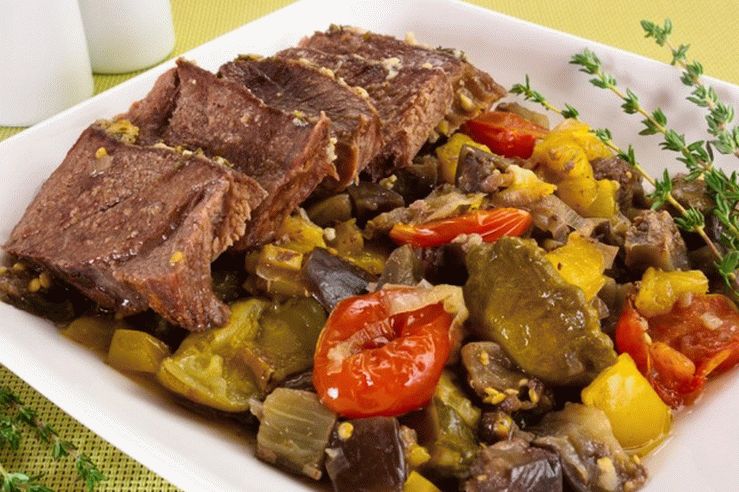 - عند التقديم للطبق النهائي ، يُقطع اللحم إلى قطع صغيرة ، وضع على طبق بجانب الخضروات المطهية.