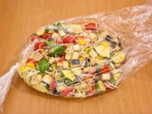 - نمزج البصل والطماطم والاسكواش والباذنجان في وعاء حجمى الفلفل. يضاف الملح والفلفل وتخلط بلطف.