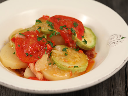 البطاطا في تركيبة مع الخضروات ولحم الخنزير المقدد جدا لذيذ. الأفضل من ذلك ، إذا كنت تطبخ هذا الطبق في المنزل من شاب البطاطا.
