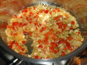 - قطع لحم الخنزير المقدد إلى شرائح وقلى في مقلاة. ثم اخراجها ثم أضيفي البصل والفلفل المفروم إلى المقلاة ، واطهيها لمدة 10 دقائق. إلى قبل دقيقة واحدة من نهاية نلقي الثوم المفروم.