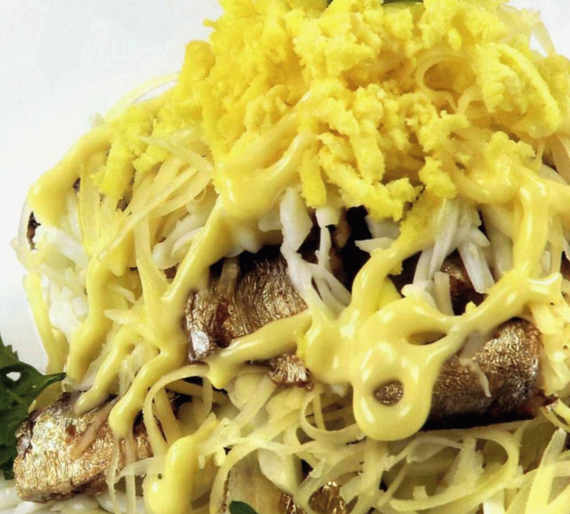 على طبق ، تنتشر: sprats ، طبقة من الجبن ، sprats ، المبشور البروتين ، طبقة من الجبن ، صفار المبشور.