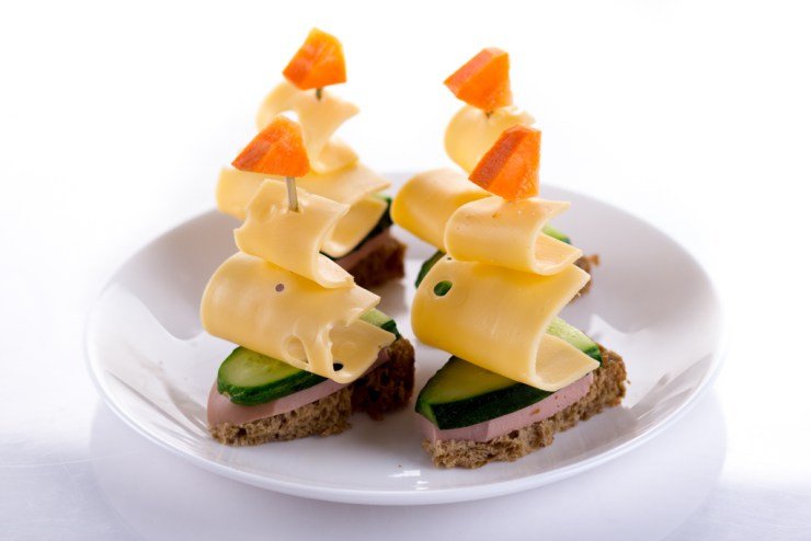 canapes في شكل قوارب مع السجق ونوعين من الجبن – هذا المقبلات اللذيذة مع التقسيم يمكن صنع هذا الطبق التركيز الرئيسي لجدول عطلة الأطفال. طبخ في المنزل هذه السندويشات الأصلية ليست صعبة على الإطلاق.