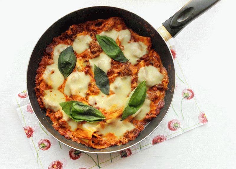 إذا كنت بحاجة إلى إطعام أسرتك بسرعة ولذيذ ، فهذه الوصفة لك الكمال. لا تحتاج هذه اللازانيا إلى أن تخبز في الفرن لفترة طويلة. الطهي في المنزل هذه المرة سيكون في مقلاة عميقة كبيرة الغطاء. وللملء ، يمكنك أن تأخذ أي النقانق لديك في الثلاجة. إذا كان هناك أيضًا لحم مفروم ، لازانيا سيجعل ذلك ألذ!