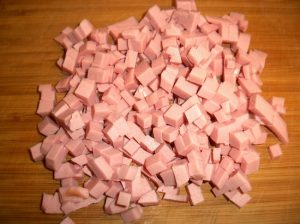 - يقطع النقانق جيدًا ويوضع في المقلاة في الأعلى. لحم مفروم مقلي.