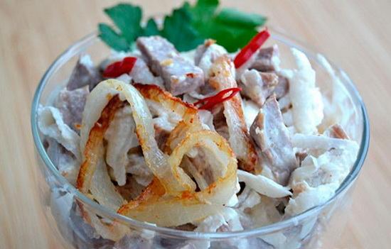سلطة مع البصل المقلي واللسان تقدم في النظارات المجزأة. الطبق له طعم غير عادي. يمكن إجراء مثل هذه السلطة الجدول عطلة.
