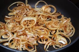 يقدم إلى الطاولة ، مزين بشرائط من الفليفلة الحلوة و حلقات البصل.