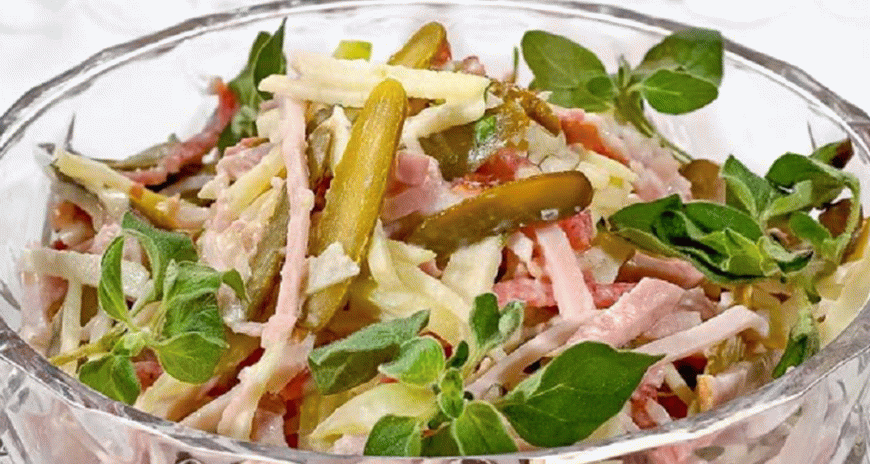 مزيج غير متوقع ولذيذ للغاية من المنتجات باللغة السويسرية سلطة. والتي يمكن إعدادها في المنزل للطاولة الاحتفالية. اجعل هذه السلطة أفضل مع أصناف حلوة من الكمثرى ، لذلك سيكون الطعم أكثر حيوية.