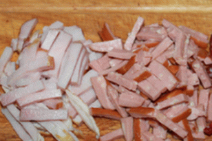 - الكربونات ولحم الخنزير والجبن مقطعة إلى شرائح طوله 2 سم.