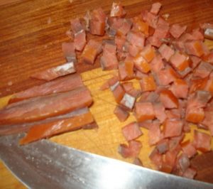 سمك السلمون الوردي المدخن للتخلص من العظام وتقطيعها إلى قطع صغيرة قطعة.