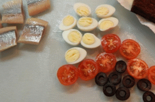 - قطع السمك والبيض في شرائح متوسطة ، وقطع الطماطم في النصف. قطع الزيتون في دوائر.