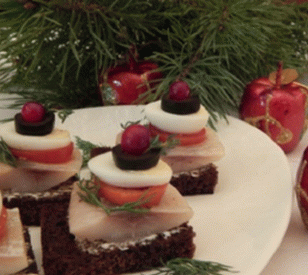 - ننشر جبن الكوخ على الخبز المحمص ونضعه في المقدمة سمك الرنجة ، وضع الطماطم والبيض والزيتون والتوت البري. نحن تزيين كل شيء الخضر.