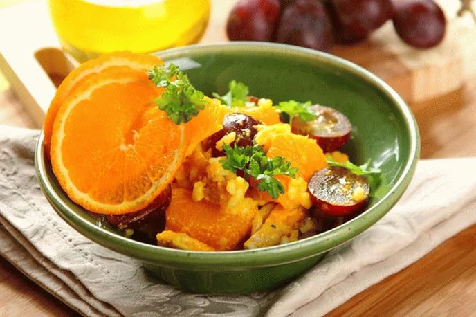 - في وعاء ، اخلطي الأرز واللحوم واليوسفي والعنب. امزج عصير البرتقال مع القليل من الكاري واسكبه هذا صلصة السلطة. ضع الطبق في أطباق ويمكن تقديمه إلى الطاولة.
