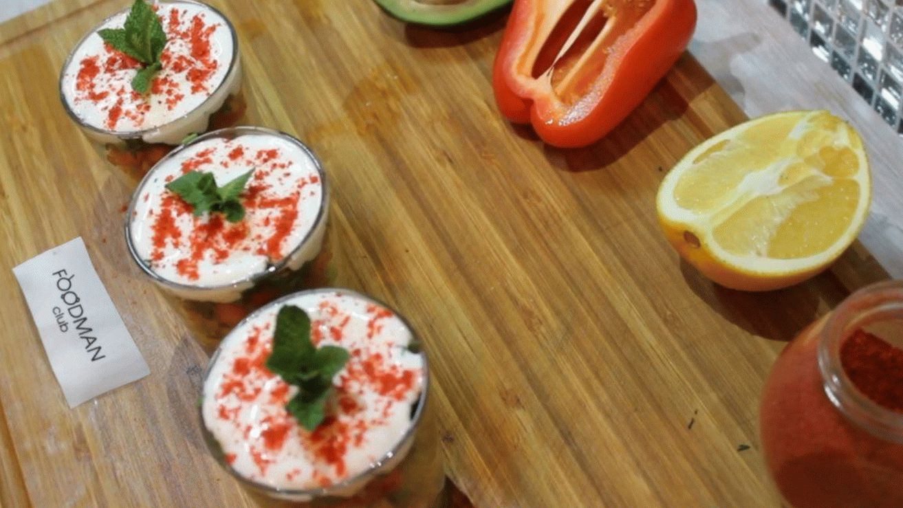 - فرم ناعماً وتوضع في كوب في طبقات: خيار ، دجاج فيليه ، برتقال مقشر ، أفوكادو مقشر ، جرس الفلفل والشبت.
