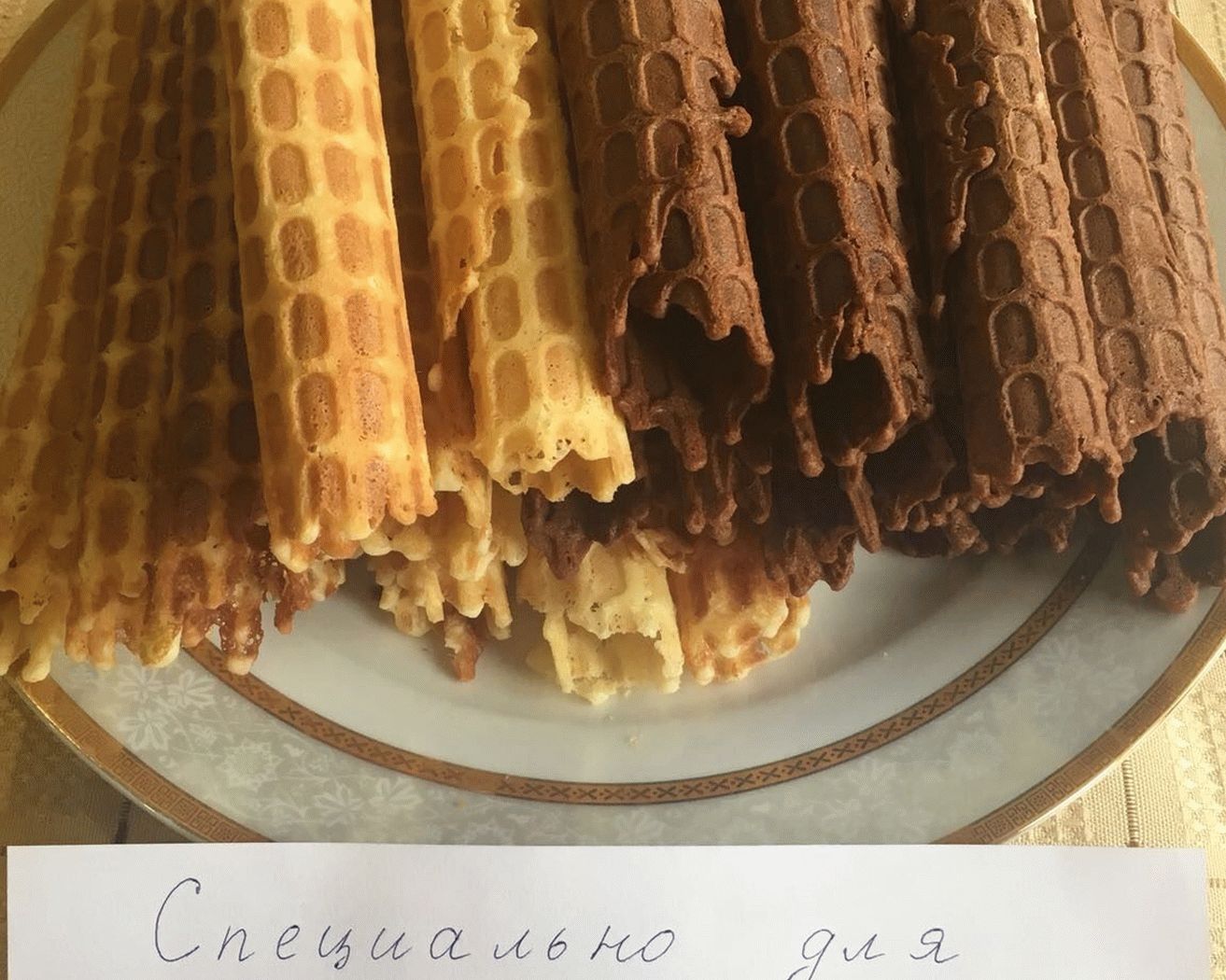 - نضع ملعقة كبيرة من حديد الوفل الكهربائي العجين ويقلى 25 ثانية ، نحول رقاقة إلى أنبوب ، في حالة ساخنة.