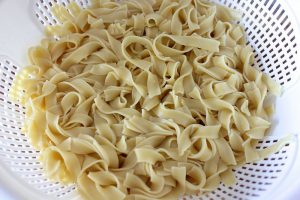 - تغلي الشعرية في كمية كبيرة من الماء المملح وتجاهل على مصفاة ، دع الماء يستنزف بالكامل.