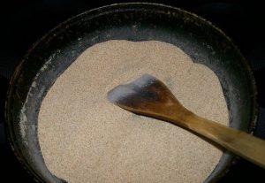- صب السميد على مقلاة جافة مسخنة (بدون زيت) ويقلى على نار خفيفة حتى يصبح لونها بنيا ذهبيا. حاجة باستمرار حرك حتى لا تحترق المجموعة.