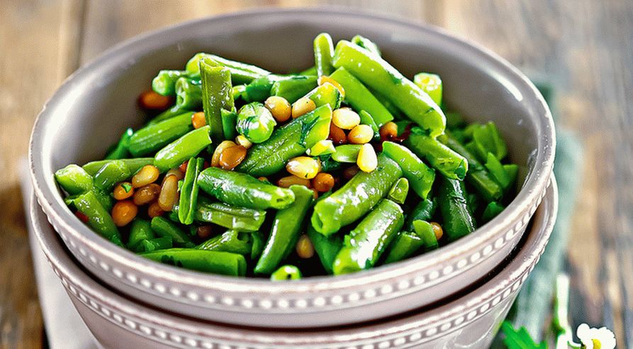 - الفاصوليا تقشر وتقطع إلى نصفين. يغلي في الغليان الماء المملح لمدة 3-4 دقائق. استنزاف الماء ، جفف الفاصوليا.