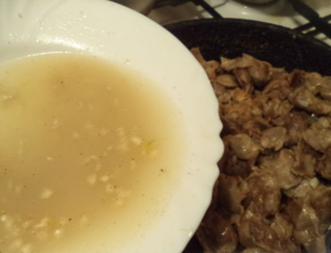 - نقوم بغسل المعدة بالماء ، وقطع الدهون والأفلام ، وقطع في النصف. وضعت في مقلاة.
