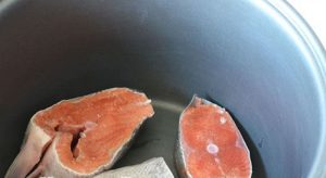 - قطع ذبيحة السمك إلى قطع ، وضعها في وعاء.