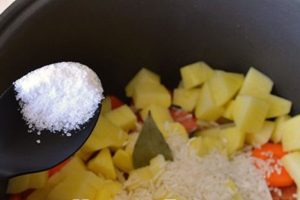 - يقطع البصل ويقطع الجزر إلى دوائر. قطع البطاطس وغسل الأرز. ضع كل شيء في الوعاء.