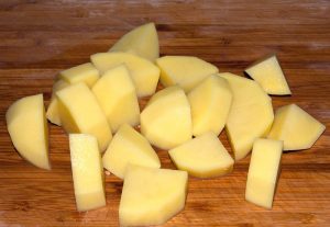 - قشر البطاطا وقطعيها إلى قطع عشوائية.