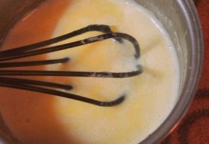 - يُسكب عصير اليوسفي ويخلط حتى يذوب السكر. بعد ذلك ، أضيفي البيض واخفقه بضربه.