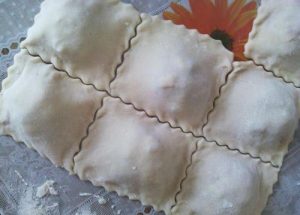 - دهن طبقة واحدة من العجين مع البيضة. وضع كرات ملء على ذلك على مسافة متساوية من بعضها البعض. غطي الجزء العلوي بطبقة ثانية الاختبار. اضغط على طبقات العجين لبعضها البعض بين الحشوة بحيث تمسك معا. قطع الرافيولي مربع بسكين مجعد.