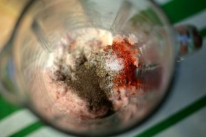 - أضف الملح والتوابل. نحن نكسر كل شيء في زي موحد الدولة. يجب أن تكون الكتلة بدون ألياف كبيرة.