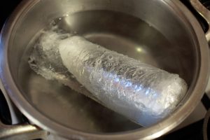 - لف النقانق في فيلم التشبث. ضع السجق في الماء الساخن (70-85 درجة) ، مرهق لمدة ساعة ونصف ، دون جلب الماء ليغلي.