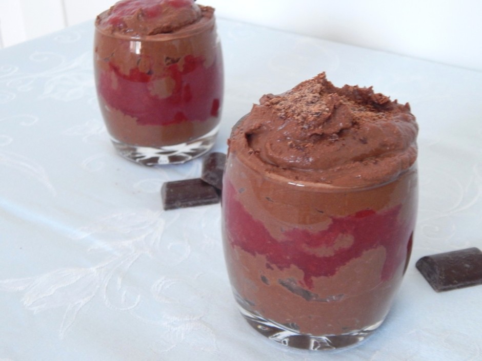 - في أكواب شفافة ، قم بنشر موس الشوكولاتة ، ثم طبقة شراب التوت. ثم موس مرة أخرى.