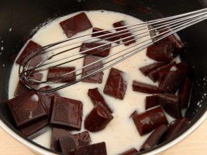 - أضف الشوكولاته إلى الحليب الساخن. مزيج حتى اكتمال تذوب مع خفقت.
