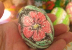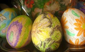 - نرسم مختلف الأشكال على البيض مع الطباشير الشمع. رسم كل شئ ممكن