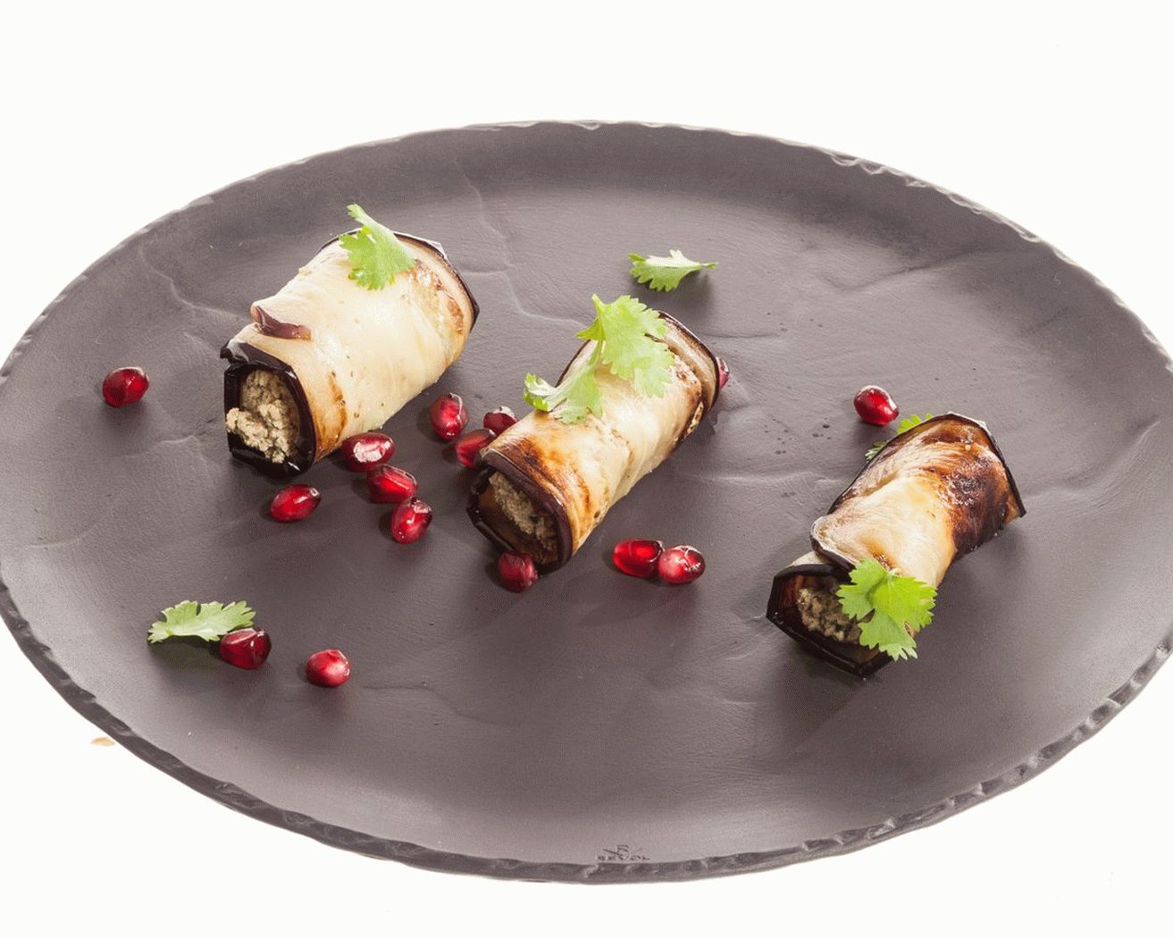 - ضعي ملء البندق على طبق الباذنجان في لفة. يرش مع بذور الرمان.
