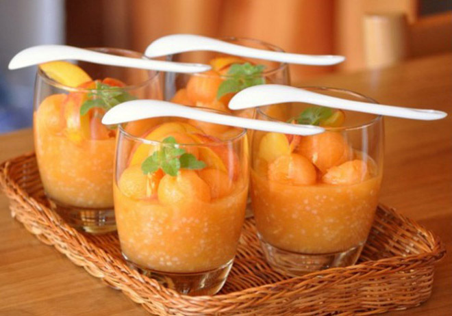 - نضع البطاطا المهروسة الجاهزة في أكواب. قطع من البطيخ المتبقية كرات مع ملعقة ووضع على رأس هريس لدينا. زليقة مقطعة إلى شرائح وتضاف إلى البطيخ. يمكن أن تكون مزينة بأوراق النعناع.