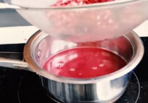 - الحرارة حتى يذوب السكر تماما ، وإزالة من الحرارة و أضف عصير الكرز. يمكنك استخدام غربال أو عصارة.