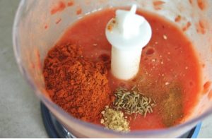 - نمزج الطماطم ونضيف إليها كل التوابل والثوم.