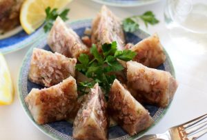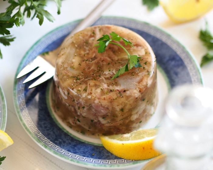 نخرج الهلام اللذيذ المصنوع من البقدونس من الحاويات ، يقطع ويقدم مع الخردل أو الفجل. اللحوم عند الطلب يمكن أن تستكمل مع بذور الكراوية المطحونة أو الكزبرة ، واستبدل البقدونس على الكزبرة أو الشبت.