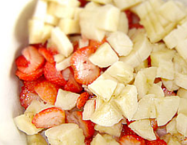 - أضف 4 قطع من الفراولة وموز صغير (مقطع).