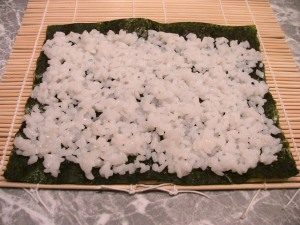 - وضع نوري أسفل على حصيرة مع الجانب لامعة أسفل. يد في ماء الخل ، وضع الأرز ، وترك مساحة خالية على القمة اثنين سم واسعة