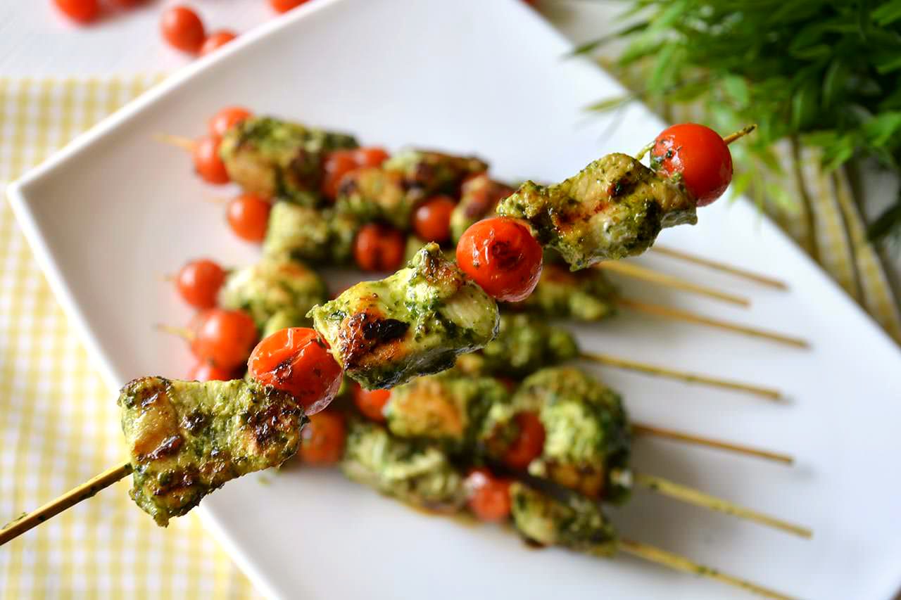- قطع الثدي إلى قطع. وضعها في وعاء ، إضافة البيستو ويقلب.