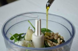 - في الخلاط ، ضعي الريحان والجبن المبشور والثوم والمكسرات ، الملح وصب الزيت. تخلط جيدا حتى تحصل الاتساق متجانسة.