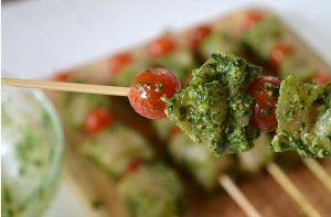 - يجب نقع الأسياخ الخشبية في الماء قبل الاستخدام. ثم نخرق قطعة من اللحم على سيخ ، تليها طماطم الكرز و بديل جدا.